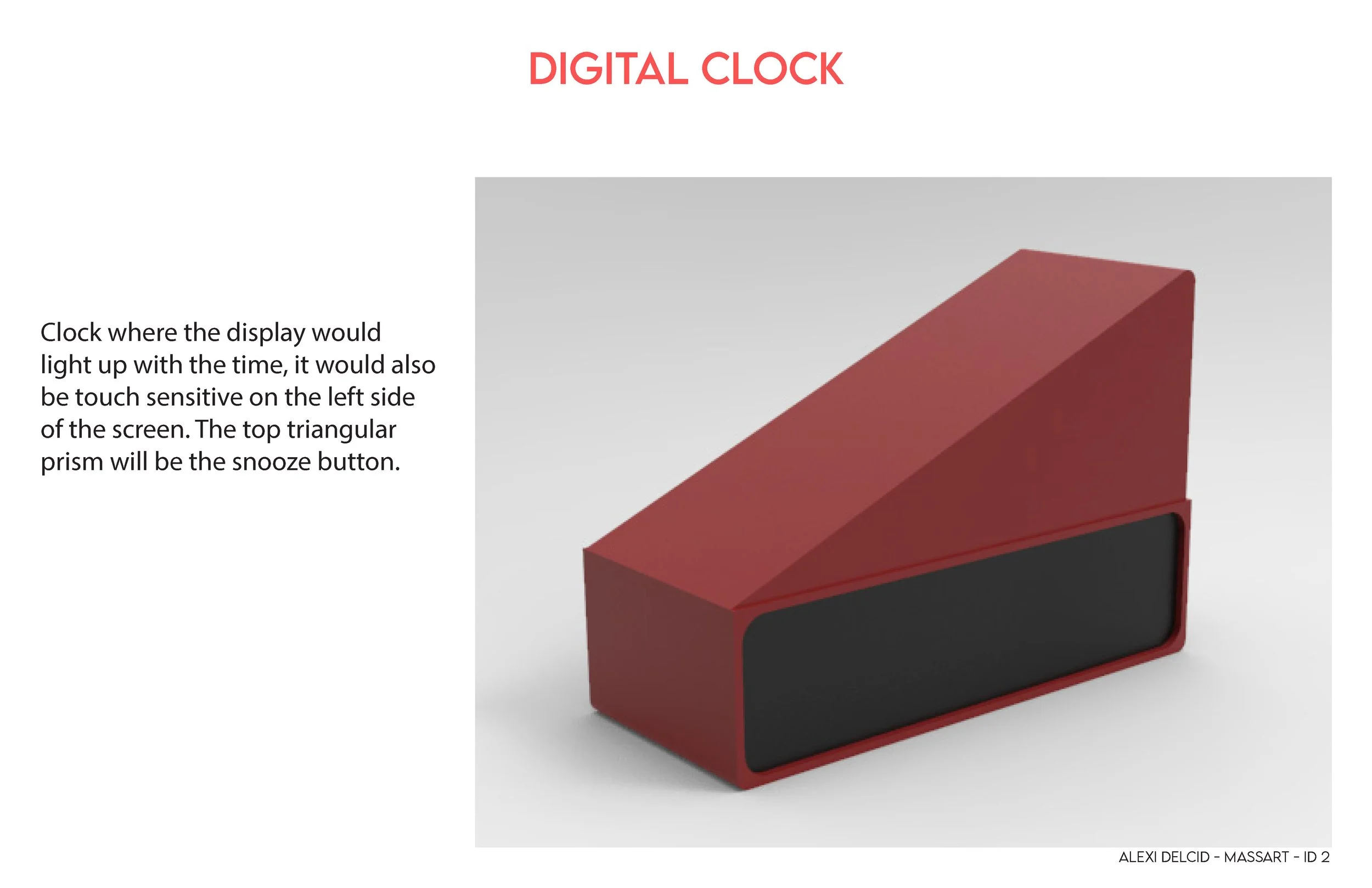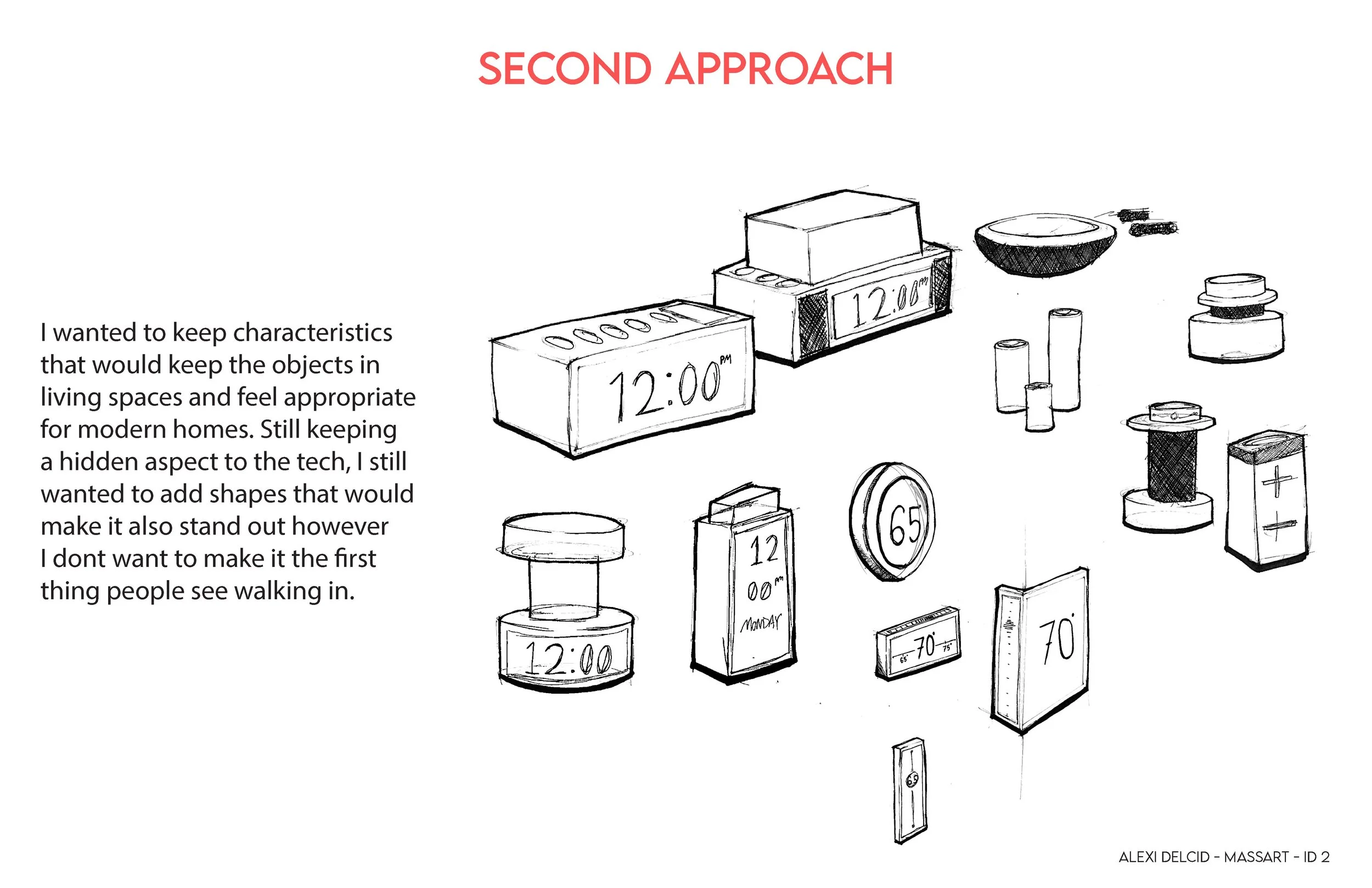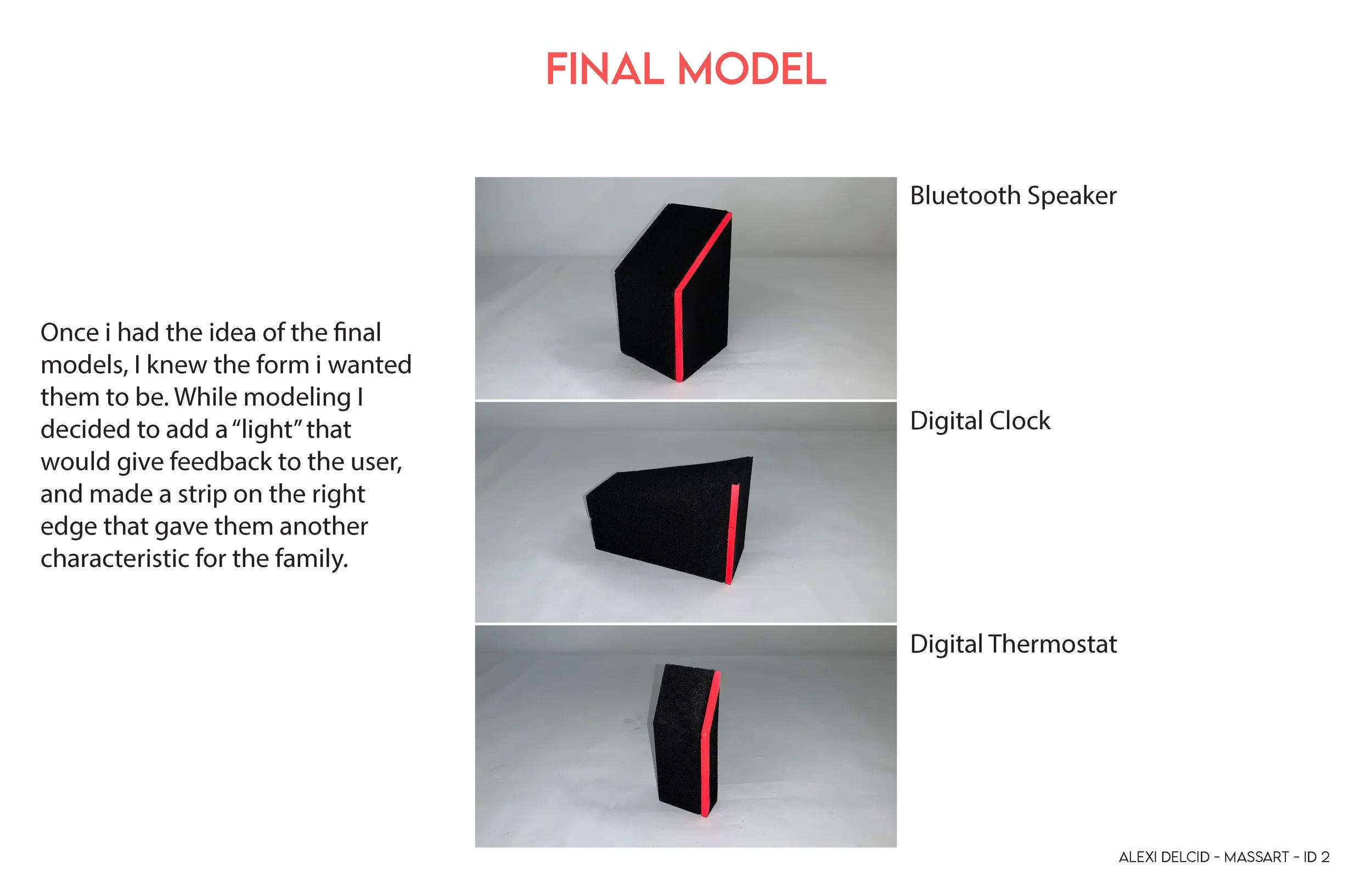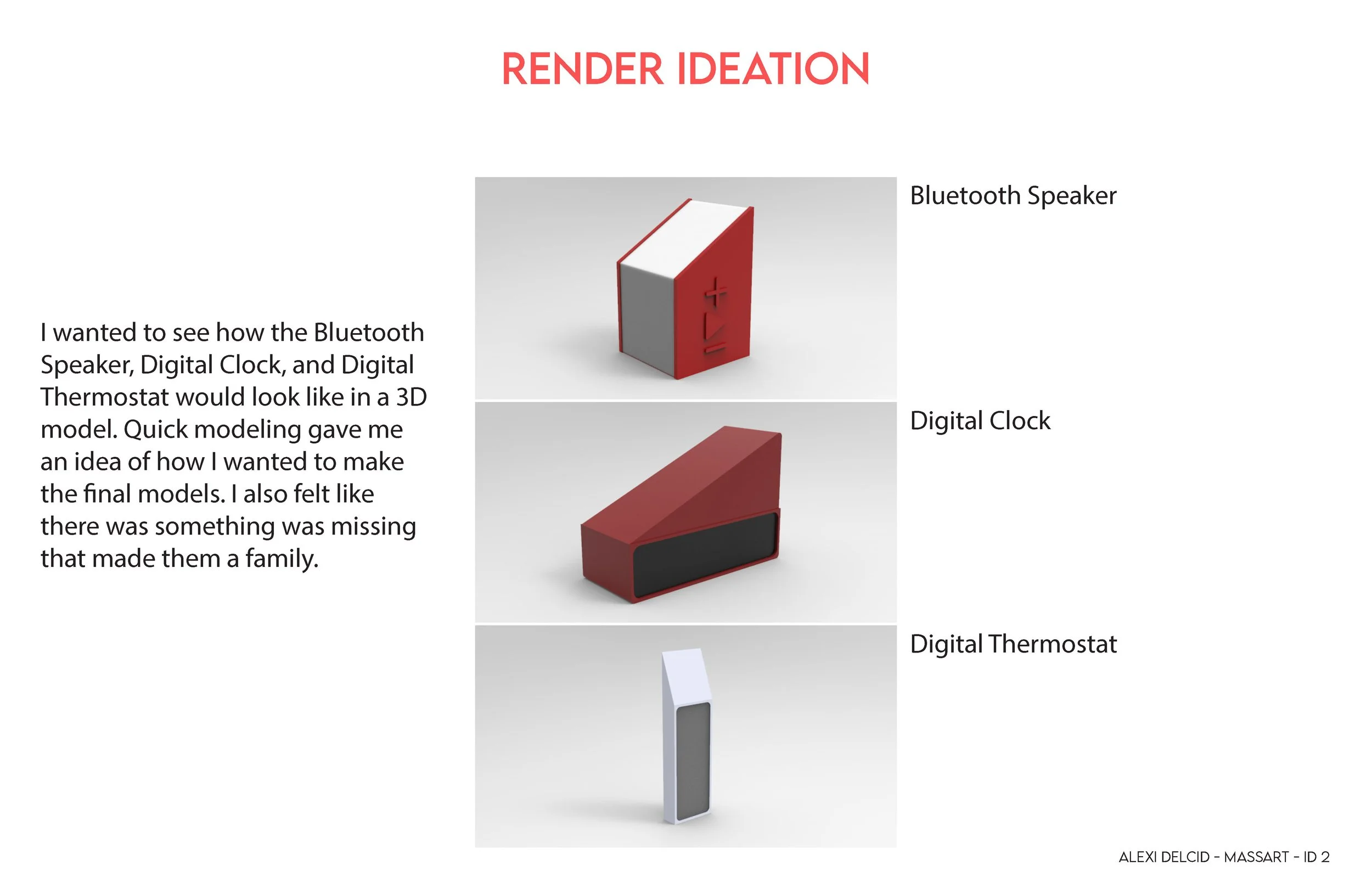 Playing with having a specific design choice on a family of gadgets, I decided to use a diagonal slant, or a cut off of a block to show the key design on a speaker, digital clock, and thermostat.